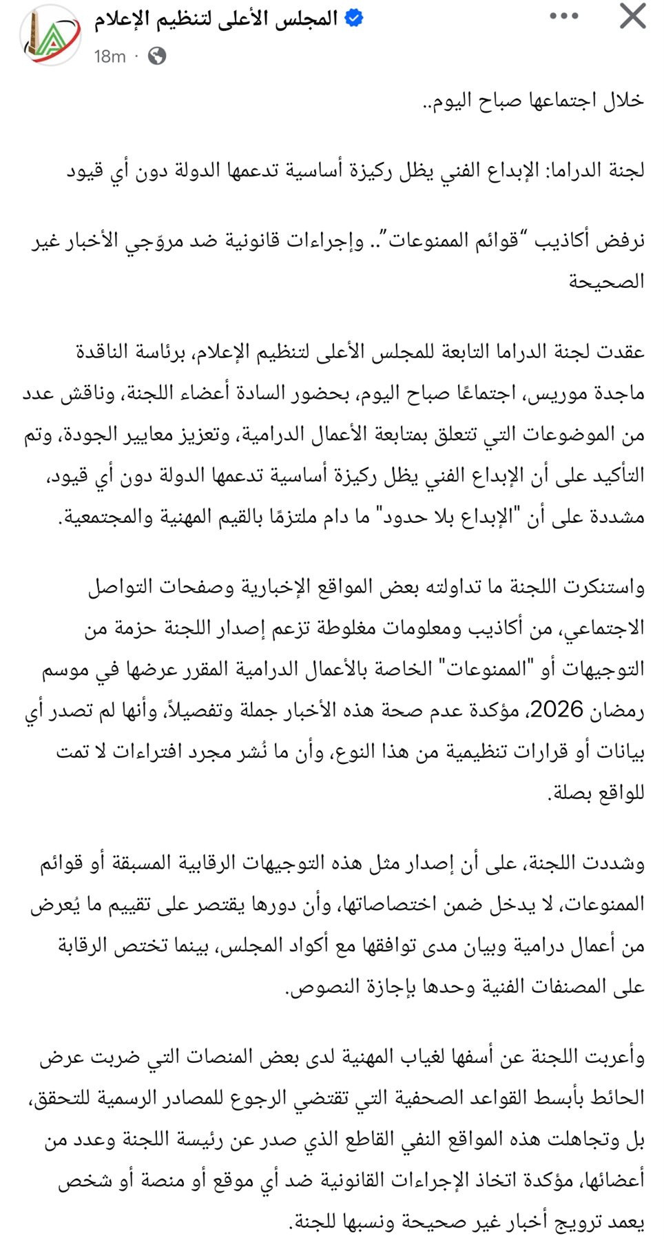 واستنكرت اللجنة ما تداولته بعض المواقع الإخبارية وصفحات التواصل الاجتماعي، من أكاذيب ومعلومات مغلوطة تزعم إصدار اللجنة حزمة من التوجيهات أو "الممنوعات" الخاصة بالأعمال الدرامية المقرر عرضها في موسم رمضان 2026، مؤكدة عدم صحة هذه الأخبار جملة وتفصيلاً، وأنها لم تصدر أي بيانات أو قرارات تنظيمية من هذا النوع، وأن ما نُشر مجرد افتراءات لا تمت للواقع بصلة.