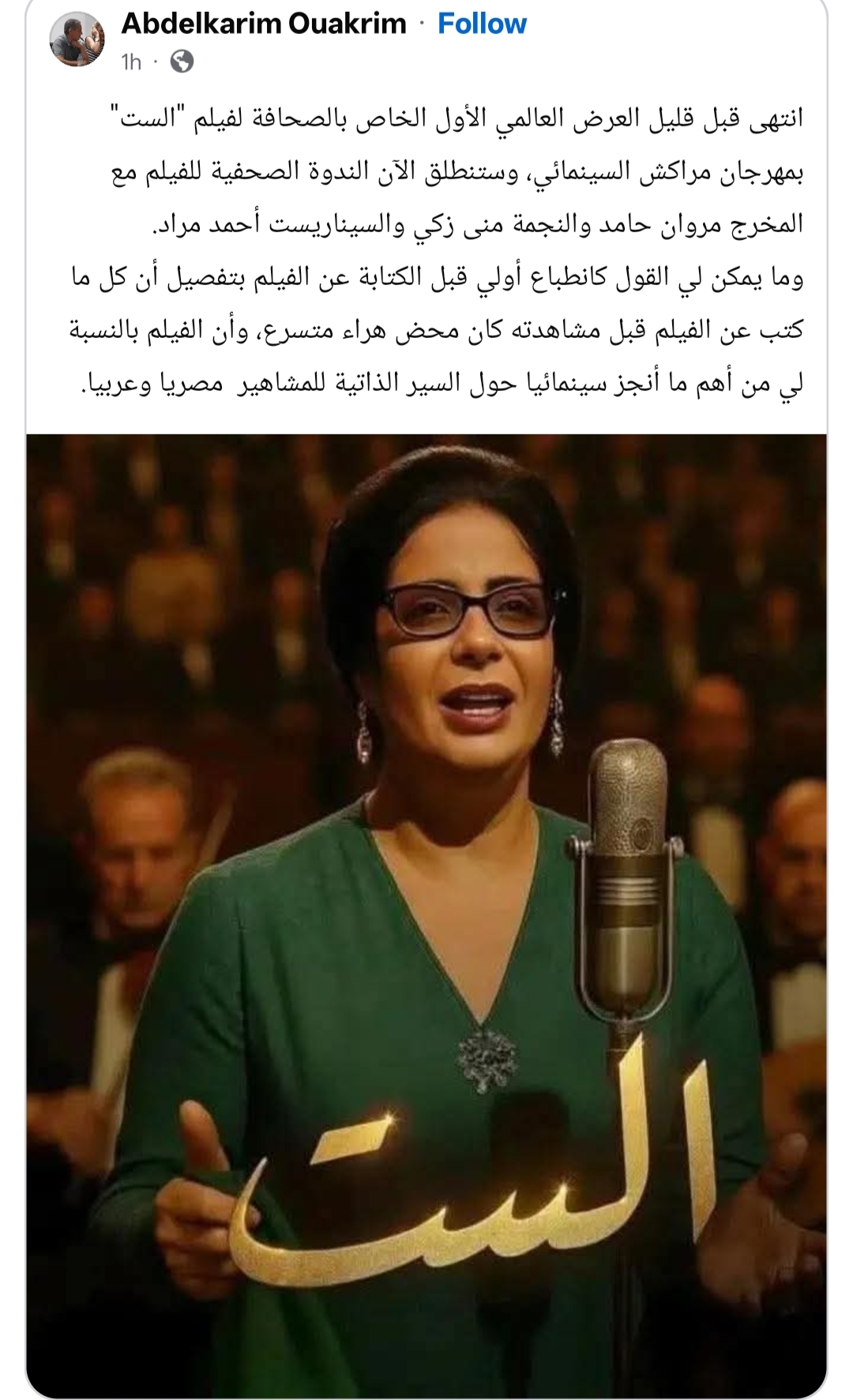 أشاد الناقد السينمائي والكاتب الصحفي المغربي عبد الكريم واكريم، رئيس تحرير مجلة سنفيليا السينمائية المتخصصة، بفيلم الست بطولة النجمة مني زكي، عقب عرضه الخاص للصحفيين الذي أقيم فى المهرجان الدولي للفيلم بمراكش، في دورته الـ 22، وذلك قبل عرضه العالمي الأول للجمهور مساء اليوم.