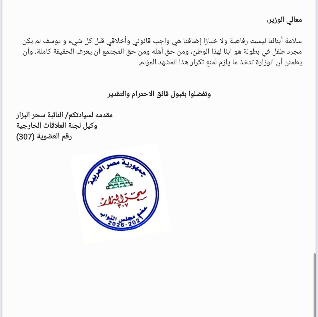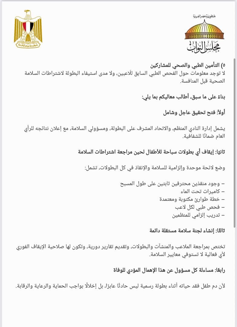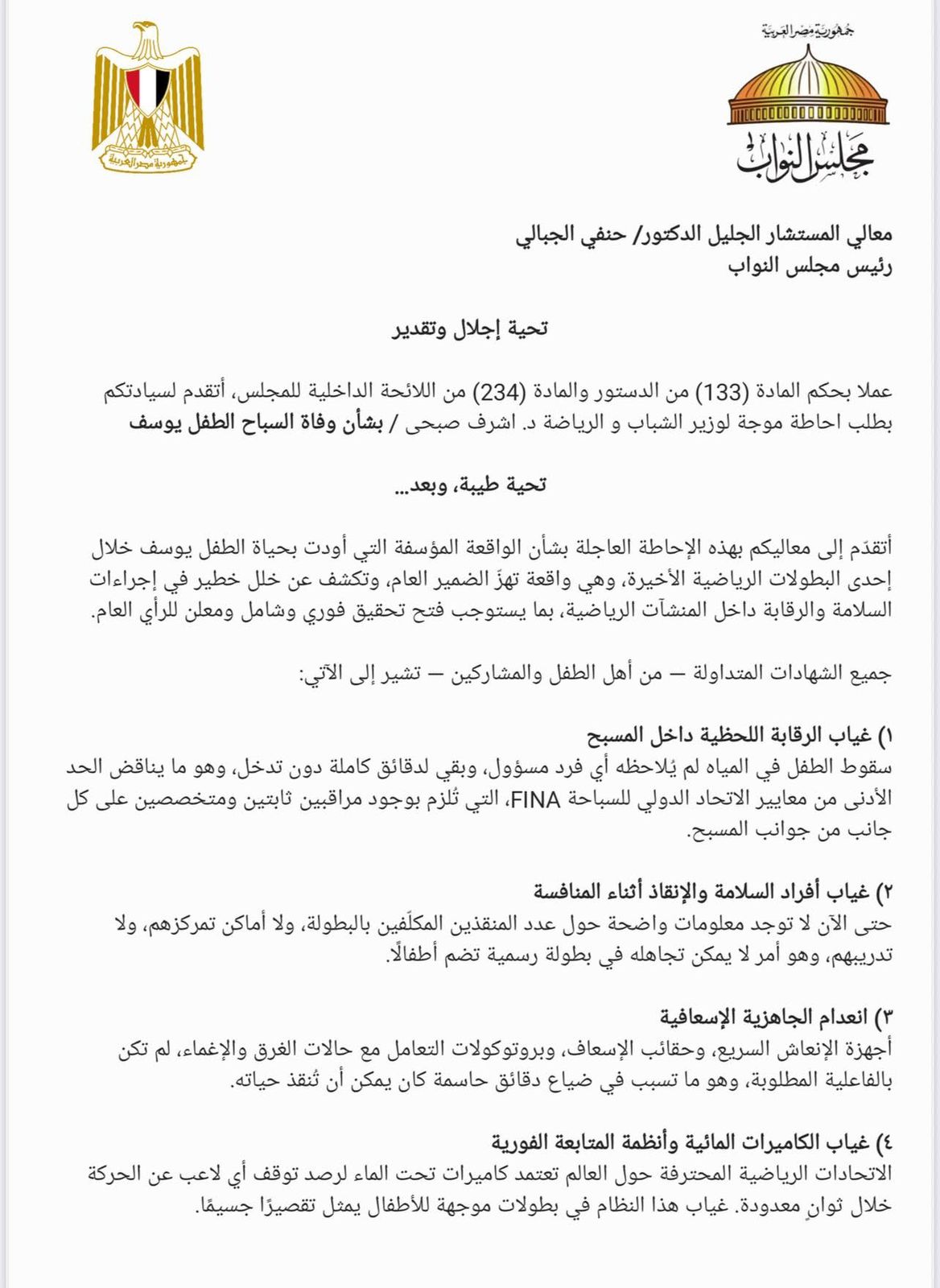 «معالي الوزير لا يصح أن يوجه سيادة الرئيس بالاهتمام باللياقة و لما أبناءنا يروحوا تدريباتهم ما يرجعوش، هذه إحاطة لسيادتكم بخصوص وفاة الطفل السباح يوسف و أطالب سيادتكم بالآتي:
