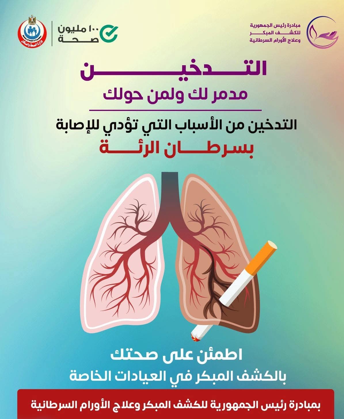 حذرت وزارة الصحة والسكان أن التدخين يُعدّ السبب الرئيس للإصابة بسرطان الرئة، إذ يتسبّب في نحو 90% من الحالات بين الرجال و80% بين النساء. وأشارت الوزارة إلى أن الدراسات العلمية أثبتت وجود صلة بين شدة التدخين وخطر الإصابة بسرطان الرئة، مؤكدةً أن التدخين بجميع أشكاله سواء السجائر التقليدية أو الإلكترونية أو الشيشة لا يزال العامل الأول لهذا المرض القاتل.