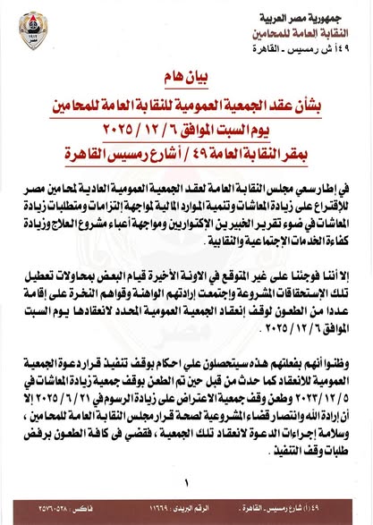 ويهيب مجلس النقابة بالسادة المحامين في الحضور والمشاركة الإيجابية يوم السبت الموافق 6 / 12 / 2025 الساعة التاسعة صباحا وما بعدها بمقر النقابة العامة للمحامين