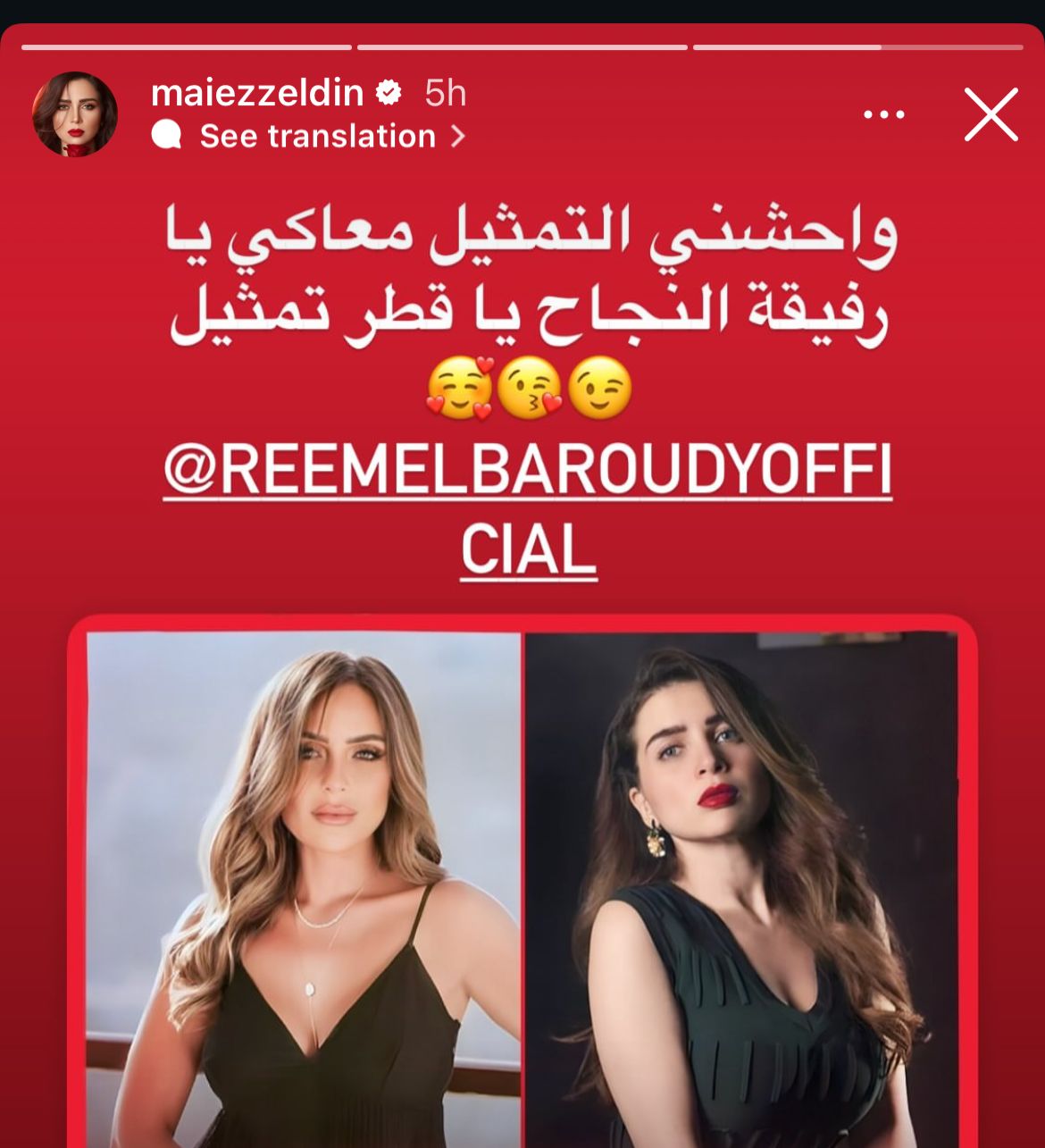 كتبت مي عبر خاصية ستوري على حسابها في إنستجرام: "واحشني التمثيل معاكي رفيقة النجاح يا قطر التمثيل"، في إشارة إلى العلاقة الفنية التي تجمعهما منذ سنوات.