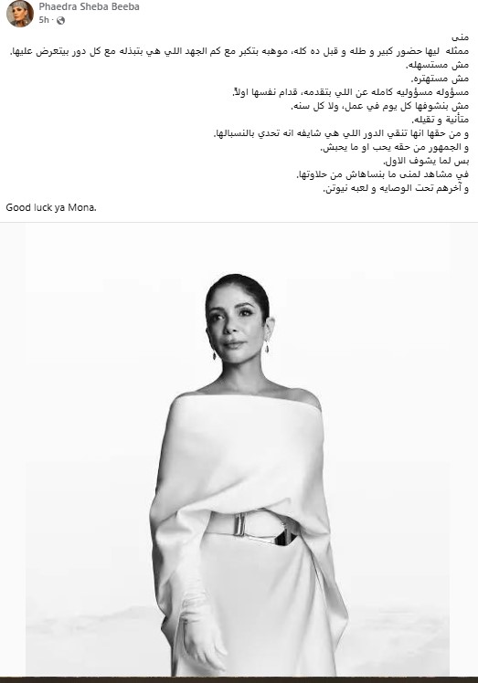 ووجهت فيدرا رسالة دعم ومحبة لـ منى زكي، وذلك من خلال حسابها الرسمي عبر موقع التواصل الاجتماعي فيسبوك، وكتبت: منى ممثله ليها حضور كبير و طله و قبل ده كله، موهبه بتكبر مع كم الجهد اللي هي بتبذله مع كل دور بيتعرض عليها، مش مستسهله، مش مستهتره، مسؤوله مسؤوليه كامله عن اللي بتقدمه، قدام نفسها اولاً.