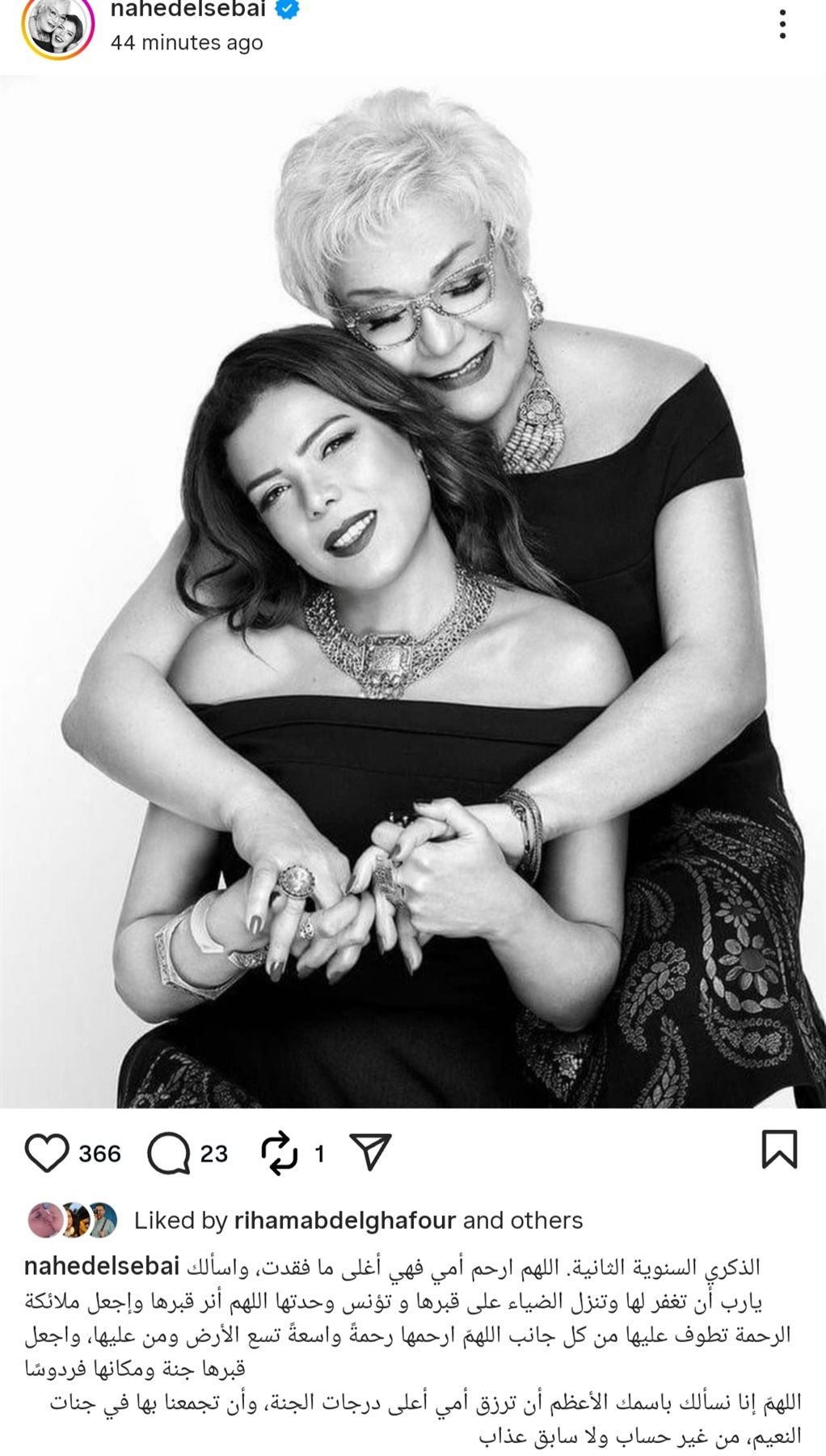 وشاركت ناهد السباعي جمهورها صورة تجمعها بوالدتها وأرثتها بكلمات حزينة، وذلك من خلال حسابها الرسمي عبر موقع تبادل الصور والفيديوهات القصيرة إنستجرام، وكتبت: الذكري السنوية الثانية، اللهم ارحم أمي فهي أغلى ما فقدت، واسألك يارب أن تغفر لها وتنزل الضياء على قبرها و تؤنس وحدتها اللهم أنر قبرها وإجعل ملائكة الرحمة تطوف عليها من كل جانب اللهم ارحمها رحمة واسعة تسع الأرض ومن عليها، واجعل قبرها جنة ومكانها فردوسا.