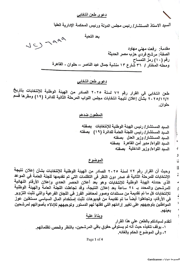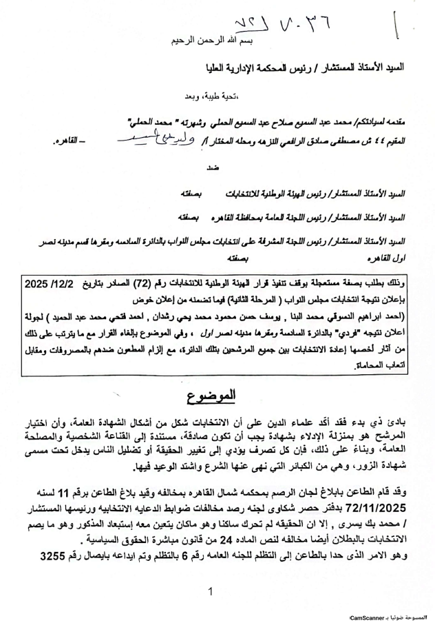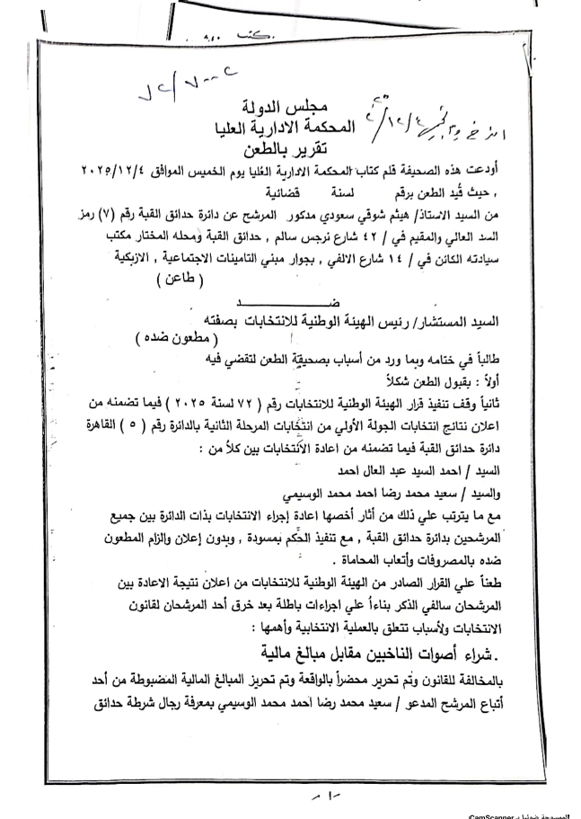 كما تقدم النائب هاني خضر، عضو مجلس النواب عن دائرة بندر ومركز شبين الكوم، بطعن رسمي أمام محكمة القضاء الإداري ضد رئيس الهيئة الوطنية للانتخابات ورئيس اللجنة العامة بالمنوفية.