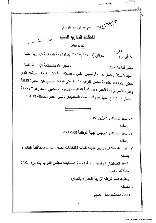 تقدم المرشح كما نجيب فرنسيس، عن الدائرة الثالثة بالقاهرة ومقرها الزاوية الحمراء، بطعن رسمي بشأن سير العملية الانتخابية بالدائرة، مشيرًا إلى وجود مخالفات قد تؤثر على نزاهة النتائج، ويأتي هذا الطعن ضمن الإجراءات القانونية المتاحة للمرشحين لضمان شفافية الانتخابات وحماية حقوق الناخبين، مطالبًا الجهات القضائية المختصة بالتحقيق في الملابسات واتخاذ الإجراءات اللازمة.