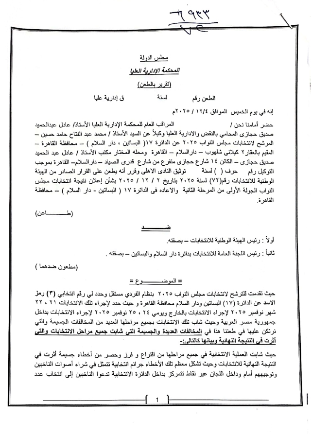 تقدم محمد سمير سراج، المرشح عن الدائرة رقم 12 بالقاهرة ومقرها الجمالية، بطعن رسمي يتعلق بالعملية الانتخابية بالدائرة، مشيرًا إلى وجود مخالفات قد تؤثر على نزاهة النتائج، ويأتي هذا الطعن ضمن الإجراءات القانونية المتاحة للمرشحين لضمان شفافية الانتخابات وحماية حقوق الناخبين، مطالبًا الجهات القضائية المختصة بالتحقيق في الملابسات واتخاذ ما يلزم من إجراءات.