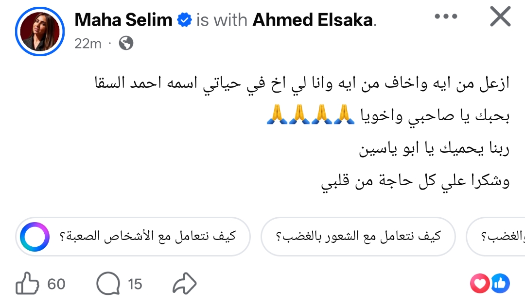 وكتبت مها سليم من خلال حسابها الرسمي عبر موقع التواصل الاجتماعي فيسبوك، قالت: ازعل من ايه واخاف من ايه وانا لي اخ في حياتي اسمه أحمد السقا.. بحبك يا صاحبي وأخويا ربنا يحميك يا أبو ياسين.. وشكرا على كل حاجه من قلبي.