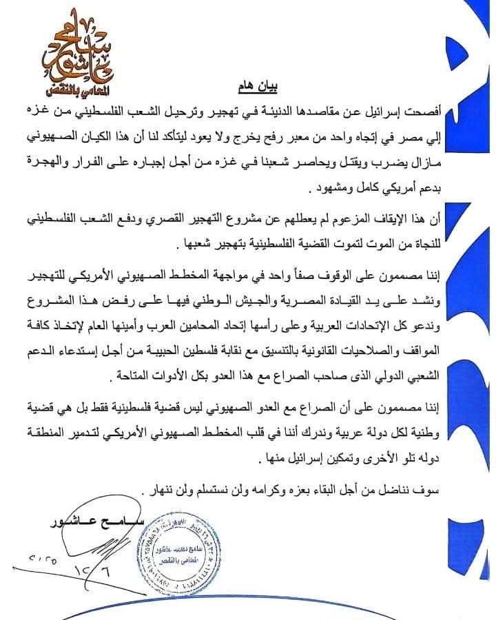أصدر سامح عاشور، نقيب المحامين السابق وعضو مجلس النواب والشيوخ السابق، بيانًا حاسمًا أكد فيه موقفه الثابت تجاه القضية الفلسطينية، مؤكدًا أن مصر ليست ممراً لتنفيذ أي مخططات تهدف إلى تهجير الفلسطينيين من أراضيهم. وقال عاشور إن الحقوق العربية، وعلى رأسها حق الشعب الفلسطيني في وطنه، ليست سلعة يمكن التلاعب بها أو التساهل بشأنها، مشددًا على ضرورة حماية هذه الحقوق والحفاظ عليها باعتبارها جزءًا من ثوابت الأمة العربية.