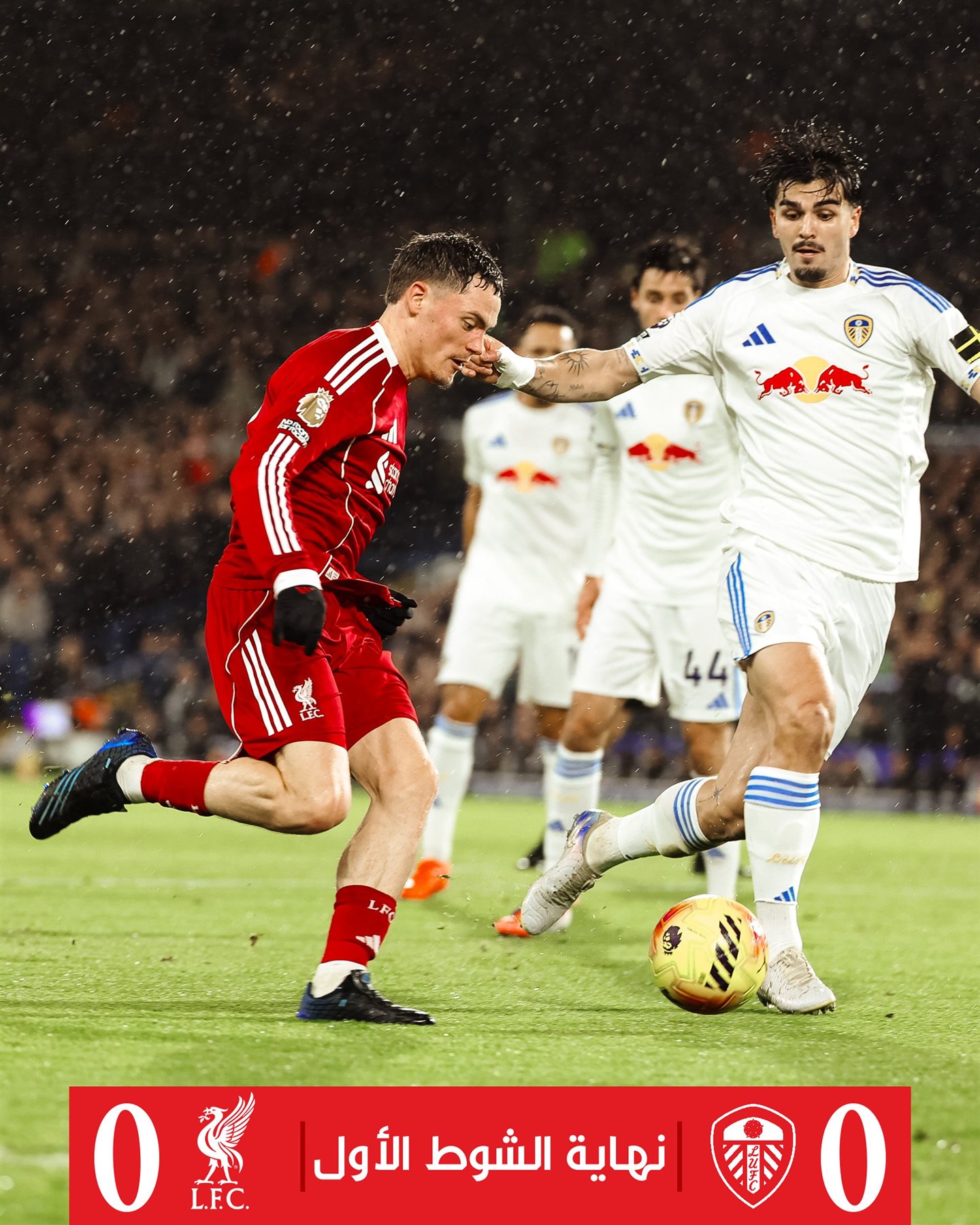 انتهى الشوط الأول من المواجهة التي تجمع بين فريقي ليدز يونايتد وضيفه ليفربول على ملعب "إيلاند رود" بالتعادل السلبي، في شوط أول اتسم بالحذر التكتيكي وافتقر إلى الفرص الحقيقية على المرميين.