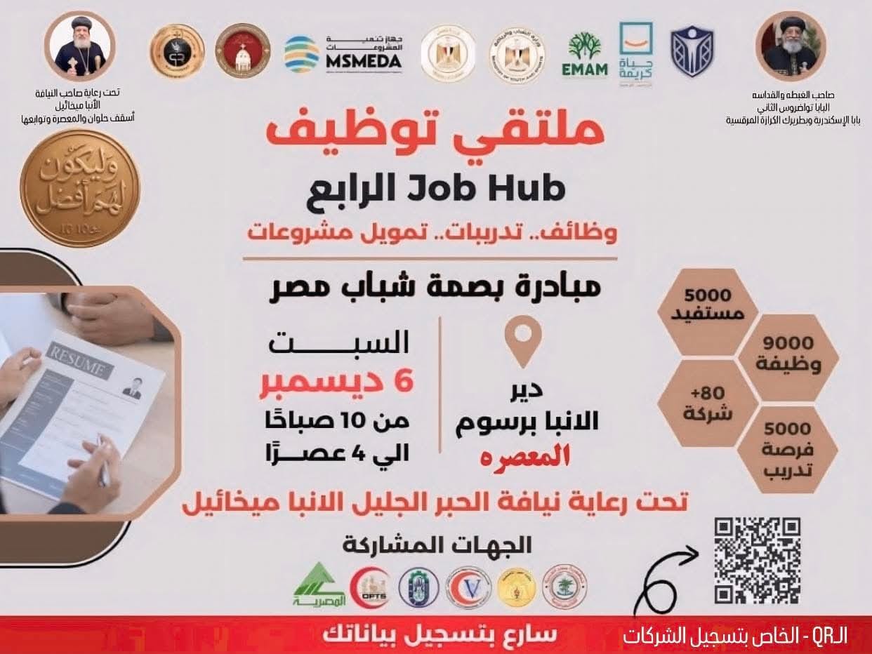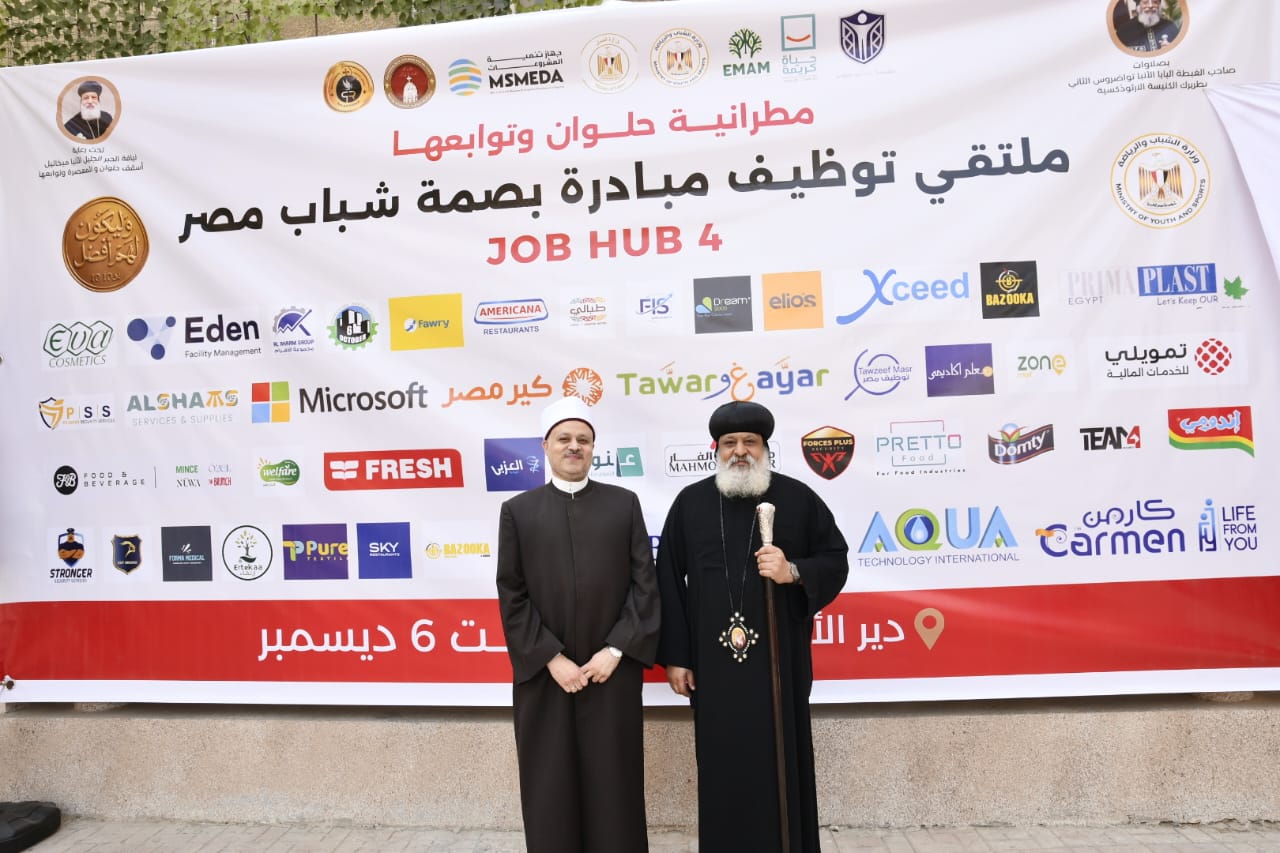 في إطار تنفيذ توجيهات وزير العمل محمد جبران ، لتعزيز فرص التشغيل ودعم الشباب، أناب الوزير جوزيف رضا، مدير عام التطوير المؤسسي بوزارة العمل لحضور فعاليات ملتقى توظيف مبادرة "بصمة شباب مصر" – JOB HUB 4، الذي نظمته مطرانية حلوان وتوابعها.
