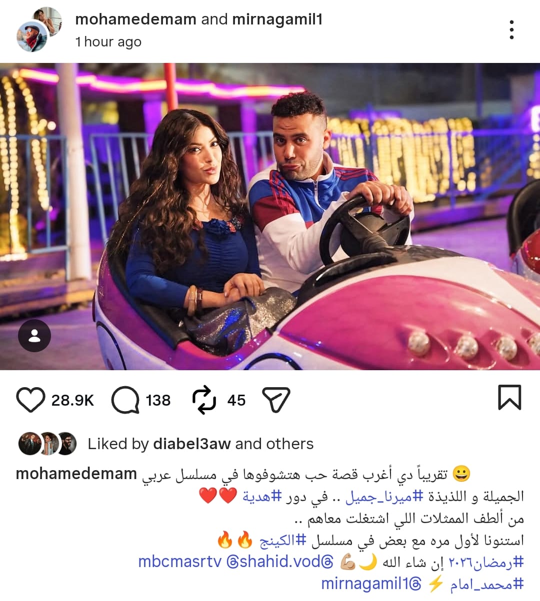 ويُعد هذا التعاون الأول الذي يجمع محمد إمام وميرنا جميل، ومن المتوقع أن يحقق الثنائي نجاحًا ملحوظًا في رمضلن 2026، حيث يعيش الثنائي قصة حب طريفة ضمن أحداث مسلسل الكينج.