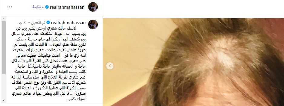 تصدر اسم الفنانة رحمة حسن قائمة الأكثر بحثًا على محرك "جوجل" خلال الساعات الأخيرة، بعد كشفها عن استمرار معاناتها مع تساقط شعرها عقب خضوعها لجلسة تجميلية استخدمت فيها مواد غير مناسبة لفروة رأسها، مما أدى إلى أضرار جسيمة يصعب علاجها .
