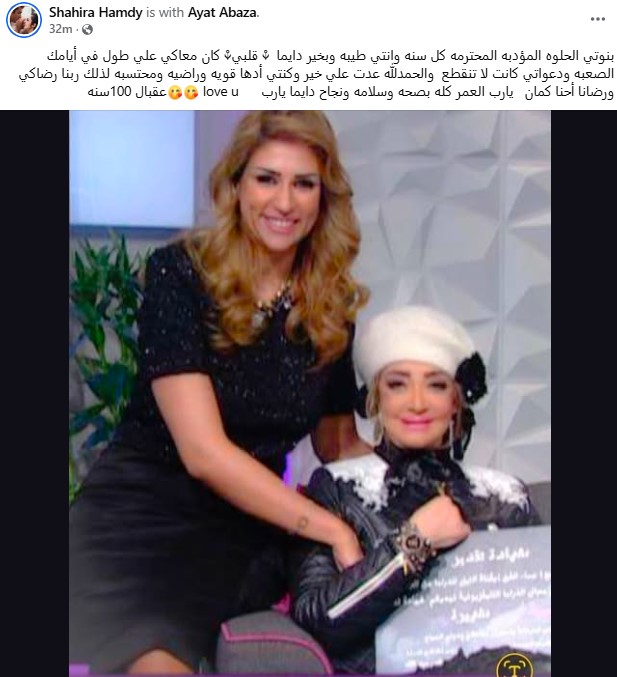 وشاركت شهيرة جمهورها صورة تجمعهما، وذلك من خلال حسابها الرسمي عبر موقع التواصل الاجتماعي فيسبوك، ووجهت لها رسالة دعم، حيث قالت:بنوتي الحلوه المؤدبه المحترمه كل سنه وانتي طيبه وبخير دايما قلبي كان معاكي علي طول في أيامك الصعبه ودعواتي كانت لا تنقطع والحمدلله عدت علي خير وكنتي أدها قويه وراضيه ومحتسبه لذلك ربنا رضاكي ورضانا أحنا كمان يارب العمر كله بصحه وسلامه ونجاح دايما يارب.. بحبك عقبال 100 سنة.