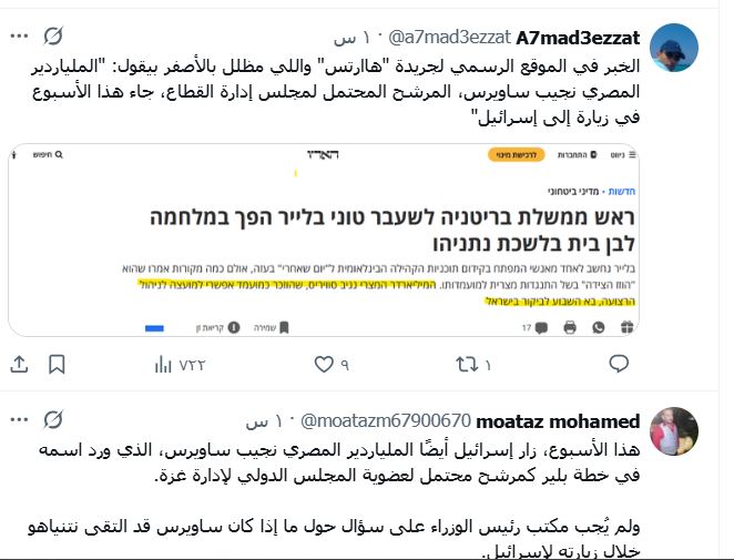 أثارت الأنباء عن زيارة الملياردير المصري نجيب ساويرس لإسرائيل، والتي أوردتها صحيفة "هآرتس" العبرية، ردود فعل واسعة على منصات التواصل الاجتماعي، حيث تناقلت حسابات مصرية وعربية تفاصيل الزيارة المرتبطة بخطط رئيس الوزراء البريطاني الأسبق توني بلير لإدارة قطاع غزة بعد العمليات العسكرية الأخيرة.