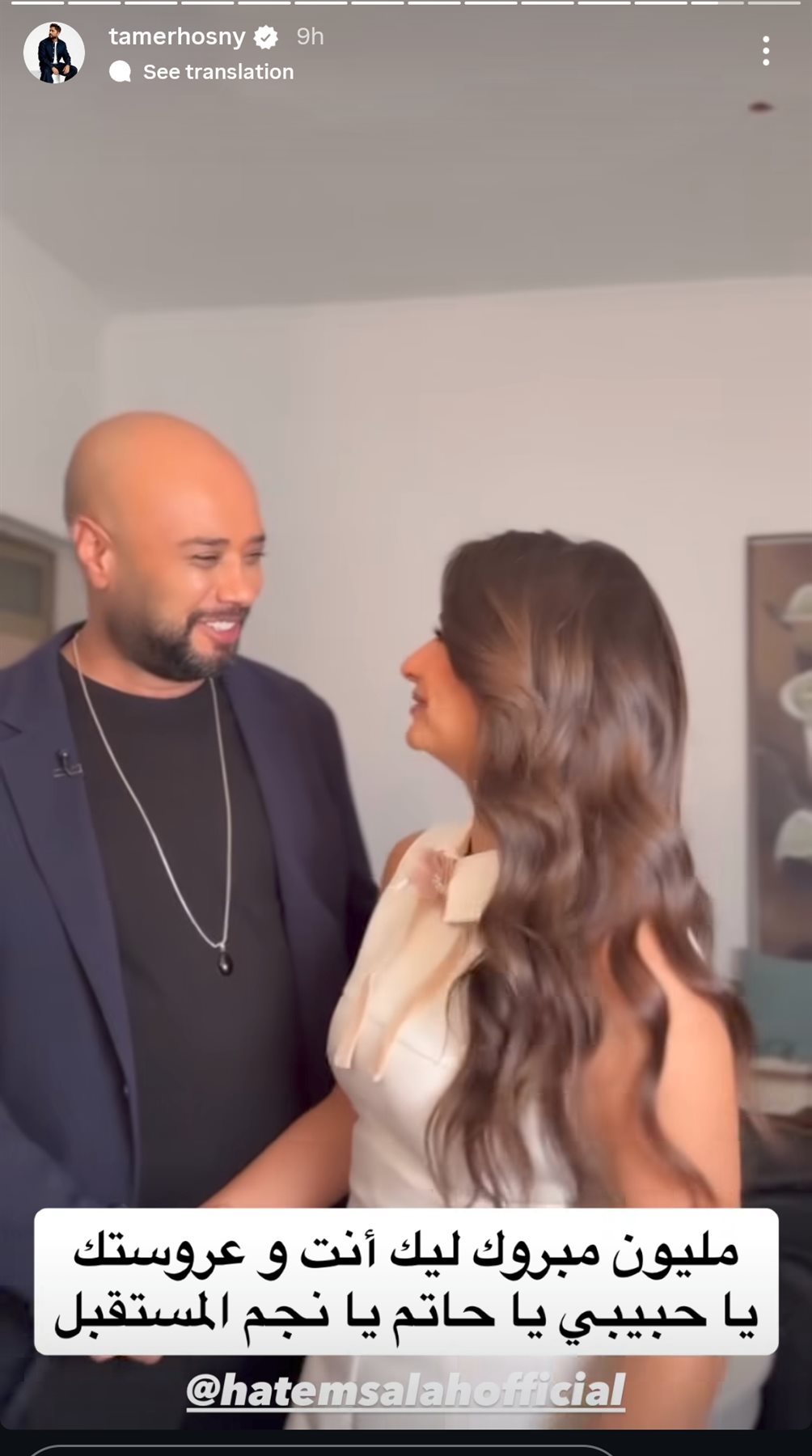 ونشر تامر حسني مقطع فيديو يجمع حاتم صلاح وزوجته، وذلك من خلال حسابه الرسمي عبر موقع تبادل الصور والفيديوهات القصيرة إنستجرام، عبر خاصية ستوري، قال:مليون مبروك ليك انت وعروستك يا حبيبي يا حاتم يا نجم المستقبل.