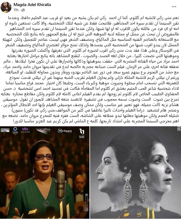 وكتبت ماجدة خير الله من خلال حسابها الرسمي عبر موقع التواصل الاجتماعي فيسبوك، قالت: نعم مني زكي لاتشبه ام كلثوم، كما ان احمد زكي لم يكن يشبه من بعيد او قريب عبد الحليم حافظ، وعندما تقرر السينما ان تقدم سيره احد المشاهير، فلاتبحث فقط عن شبيه لتلك الشخصيه، والا كانت تستعين بابوه او امه او اي فرد من عائلته يكون الاقرب له او لها شبها.