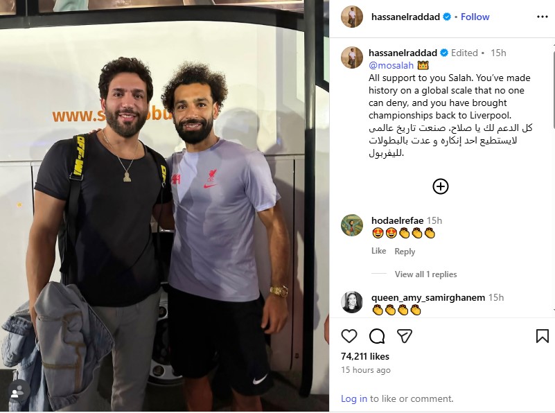 وشارك حسن الرداد جمهوره صورة تجمعه بـ محمد صلاح، ووجه له رسالة من خلالها، وذلك من خلال حسابه الرسمي عبر موقع تبادل الصور والفيديوهات القصيرة إنستجرام، وكتب: كل الدعم لك يا صلاح، صنعت تاريخ عالمى لايستطيع احد إنكاره و عدت بالبطولات لليفربول.