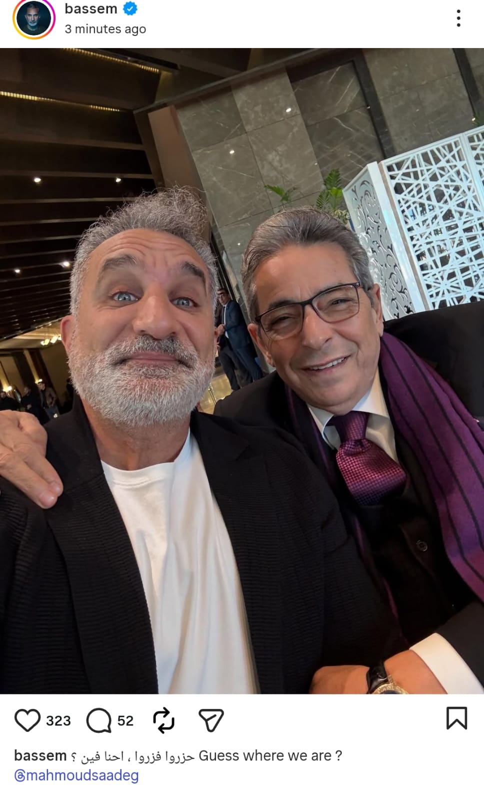 شارك الإعلامي باسم يوسف جمهوره صورة تجمعه بالإعلامي محمود سعد، أثناء وجودهما في أحد الأماكن، ما أشعل فضول المتابعين لمعرفة السبب وراء لقائهما.