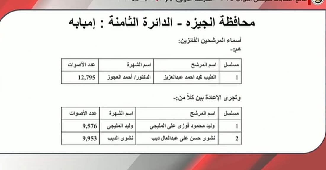 أعلنت الهيئة الوطنية للانتخابات منذ قليل بالمؤتمر الصحفي، فوز أحمد العجوز بأحد مقعدي إمبابة، وإعادة بين المليجي ونشوى الديب على المقعد الثاني.