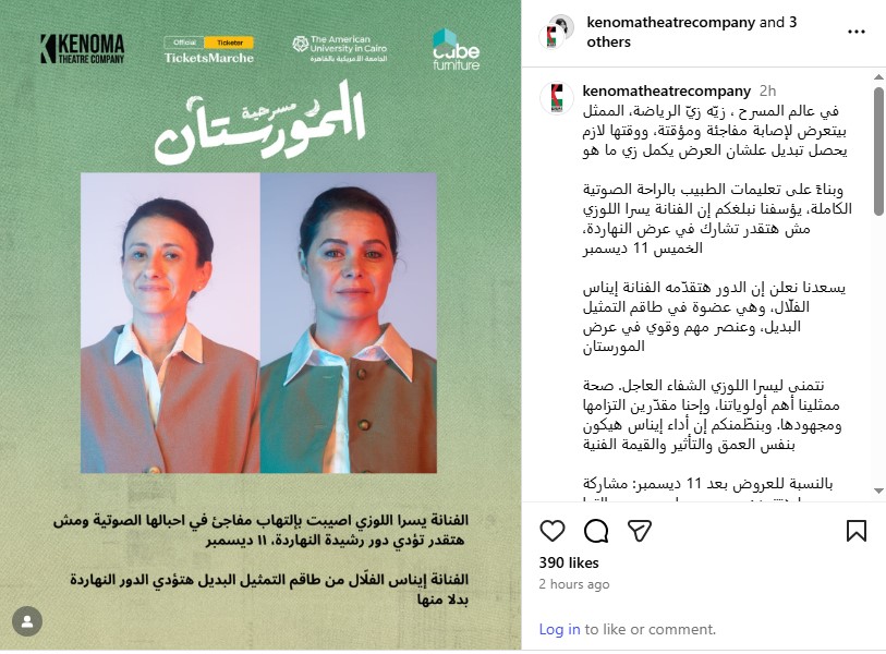 ونشرت الصفحة الرسمية لـ مسرحية المورستان، بيانًا رسميًا لها، من خلال حسابها عبر موقع تبادل الصور والفيديوهات القصيرة إنستجرام، وجاء البيان كالتالي: في عالم المسرح ، زيّه زيّ الرياضة، الممثل بيتعرض لإصابة مفاجئة ومؤقتة، ووقتها لازم يحصل تبديل علشان العرض يكمل زي ما هو، وبناءً على تعليمات الطبيب بالراحة الصوتية الكاملة، يؤسفنا نبلغكم إن الفنانة يسرا اللوزي مش هتقدر تشارك في عرض النهاردة، الخميس 11 ديسمبر.