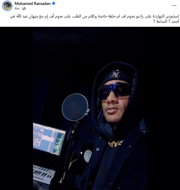 ونشر محمد رمضان صورة له، من خلال حسابه الرسمي عبر موقع التواصل الاجتماعي فيسبوك، وكتب: استنوني انهاردة على راديو نجوم إف إم حلقة خاصة وكلام من القلب على نجوم إف إم مع جيهان عبد الله في أجمد 7 الساعة 7.