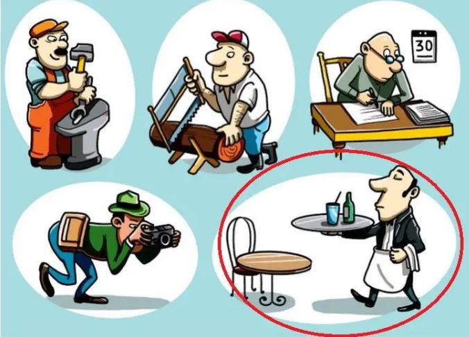 أما النادل الذي يقدم المشروبات، فيحمل الصينية في يده اليمنى، مما يشير إلى أنه سيستخدم يده اليسرى لوضع المشروبات على طاولة الزبائن. لذلك، النادل هو الشخص الأعسر بالتأكيد.