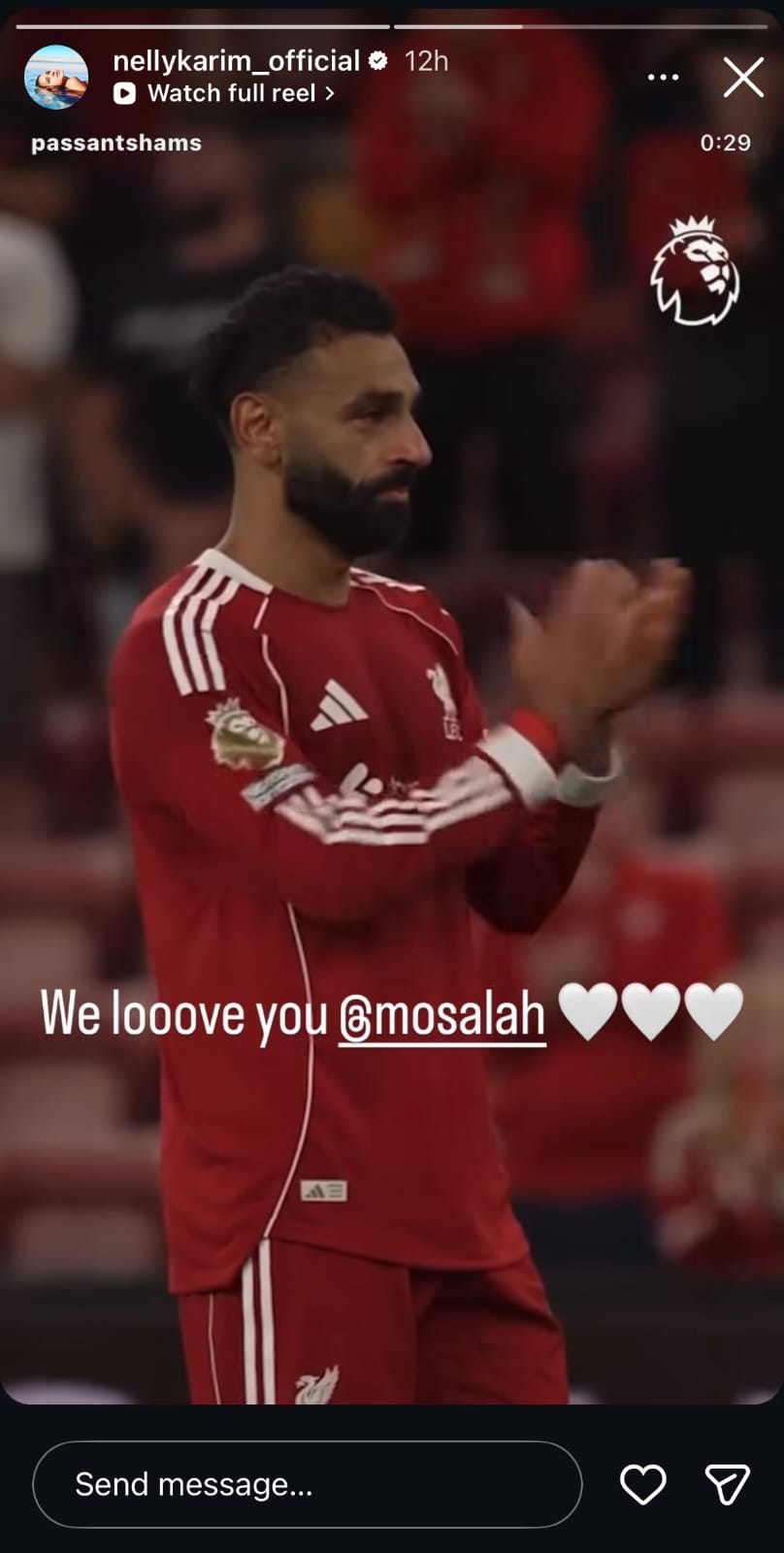 ونشرت نيللي كريم صورة لـ محمد صلاح من خلال حسابها الرسمي عبر موقع تبادل الصور والفيديوهات القصيرة إنستجرام، عبر خاصية ستوري، وكتبت:بنحبك يا محمد صلاح.