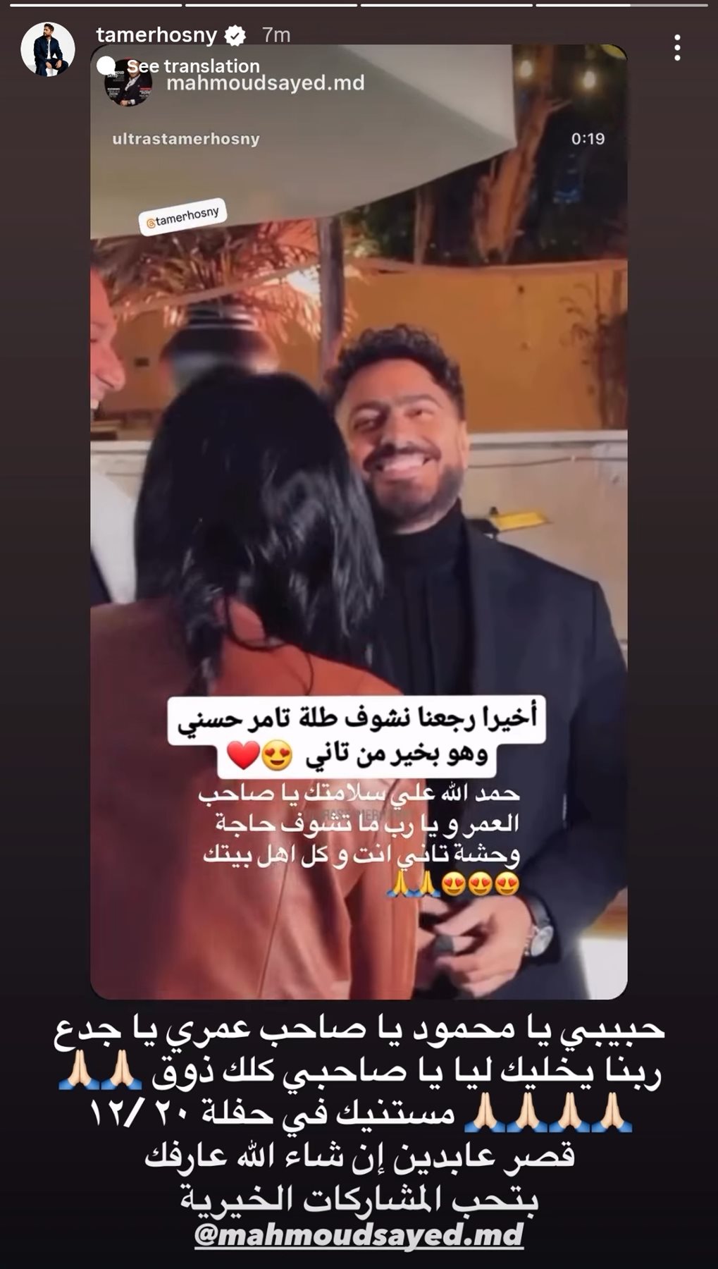 وكتب تامر حسني من خلال حسابه الرسمي عبر موقع تبادل الصور والفيديوهات القصيرة إنستجرام، عبر خاصية ستوري، تعليقًا على إحدى الفيديوهات لصديقه: حبيبي يا محمود يا صاحب عمري يا جدع ربنا يخليك ليا يا صاحبي كلك ذوق.