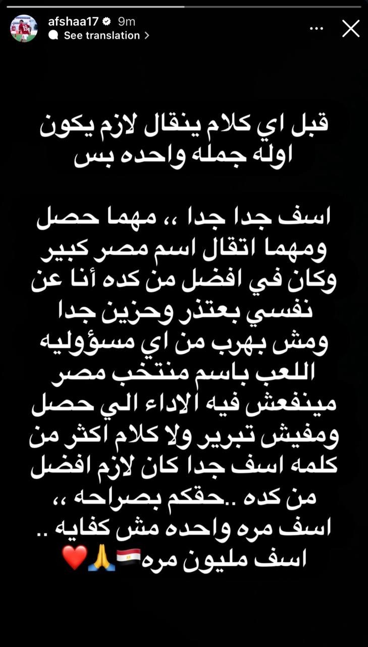 وكتب أفشة في رسالته للجماهير:" قبل أي كلام ينقال لازم يكون أوله جملة واحدة بس آسف جدا جدا، مهما حصل ومهما اتقال اسم مصر كبير وكان في أفضل من كده ، أنا عن نفسي باعتذر وحزين جدا ومش بهرب من أي مسئوليه."