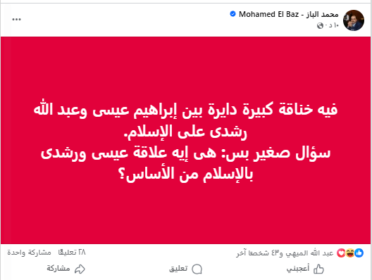وكتب الدكتور محمد الباز،، عبر صفحته الرسمية على "فيسبوك" منشورًا قائلًا: فيه خناقة كبيرة دايرة بين إبراهيم عيسى وعبد الله رشدى على الإسلام.