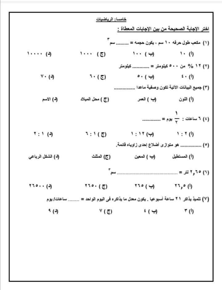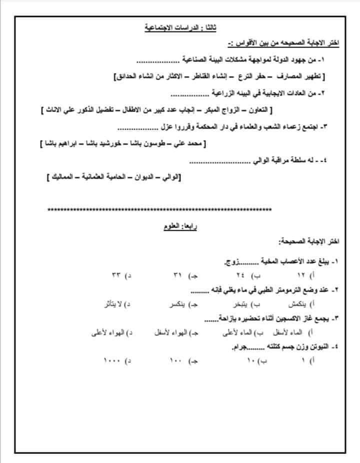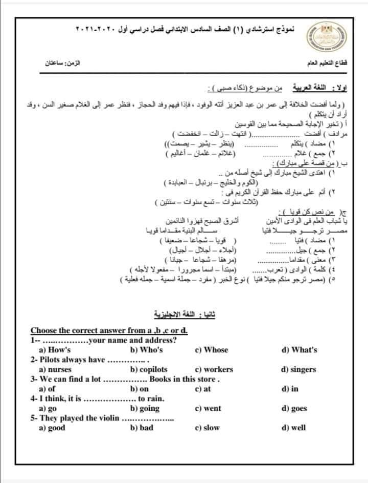 نماذج امتحانات الصف السادس الابتدائي الترم الأول ونظام الأسئلة