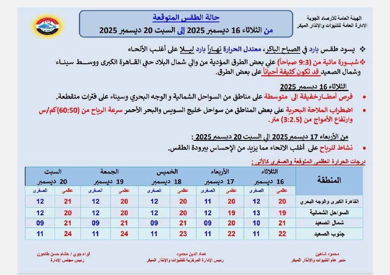 وفيما يلي بيان بدرجات الحرارة العظمى والصغرى المتوقعة خلال الفترة من الثلاثاء 16 ديسمبر وحتى السبت 20 ديسمبر: