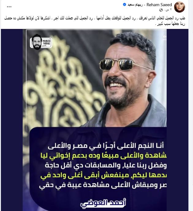 وكتبت ريهام سعيد عبر حسابها الرسمي "فيس بوك" طب رد الجميل خلي الناس تعرفك . رد الجميل للوقفتك بطل أدامها ، رد الجميل اللي عملت لك اجر . اشكرها لان لولاها مكنش ده حصل ربنا جعلها سبب كبير ".