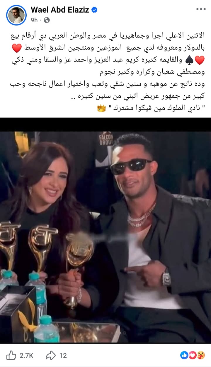 ونشر عبد العزيز صورة تجمع ياسمين عبد العزيز والفنان محمد رمضان وعلق عليها " الاتنين الاعلي اجرا وجماهيريا في مصر والوطن العربي دي أرقام بيع بالدولار ومعروفه لدي جميع الموزعين ومنتجين الشرق الأوسط