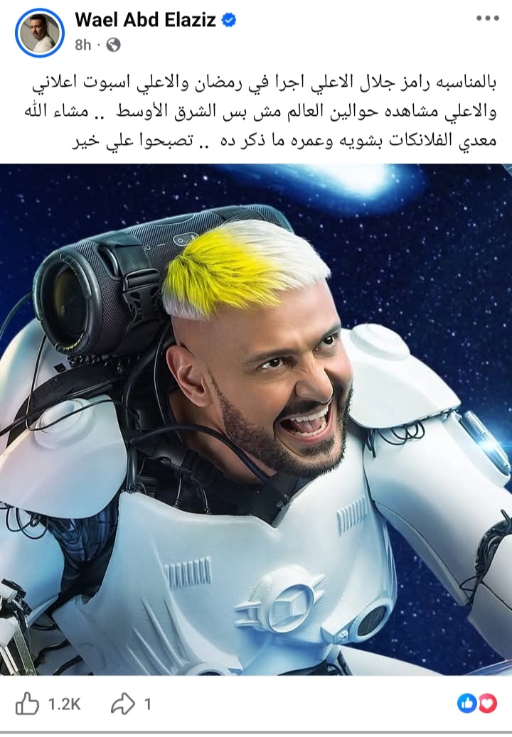 كما نشر صورة للنجم رامز جلال وعلق عليها " بالمناسبه رامز جلال الاعلي اجرا في رمضان والاعلي اسبوت اعلاني والاعلي مشاهده حوالين العالم مش بس الشرق الأوسط .. مشاء الله معدي الفلانكات بشويه وعمره ما ذكر ده ".