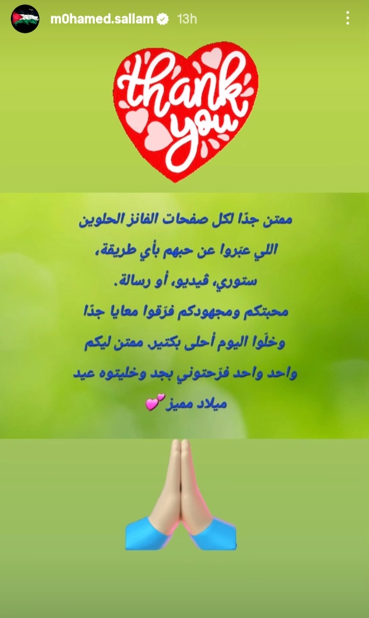 وكتب سلام من خلال الاستوري علي صفحته الرسمية " إنستجرام"ممتن جدا لكل صفحات الفانز والمعجبين الحلوين اللى عبروا عن حبهم بأى طريقة، محبتكم ومجهودكم فرقوا معايا جدًا، وخلوا اليوم أحلى بكتير.، ممتن ليكم واحد واحد، فرحتونى بجد وخليتوه عيد ميلاد مميز".