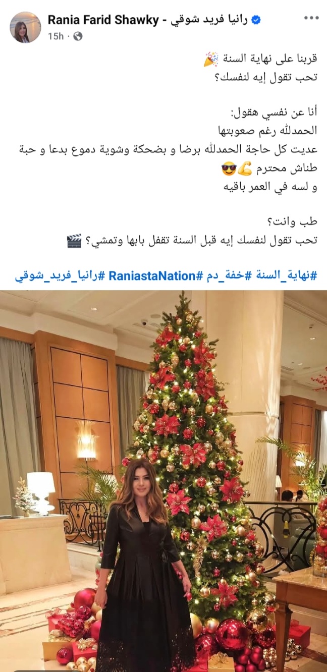 ونشرت رانيا صورة لها من امام شجرة الكريسماس عبر صفحتها الرسمية " فيس بوك " وعلقت عليها " قربنا على نهاية السنة تحب تقول إيه لنفسك؟