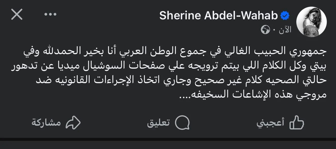 قالت الفنانة شيرين عبد الوهاب، عبر حسابها بموقع فيسبوك: جمهوري الحبيب الغالي في جموع الوطن العربي أنا بخير الحمد لله وفي بيتي، وكل الكلام اللي بيتم ترويجه على صفحات السوشيال ميديا عن تدهور حالتى الصحية كلام غير صحيح، وجار اتخاذ الإجراءات القانونية ضد مروجي هذه الشائعات السخيفة.