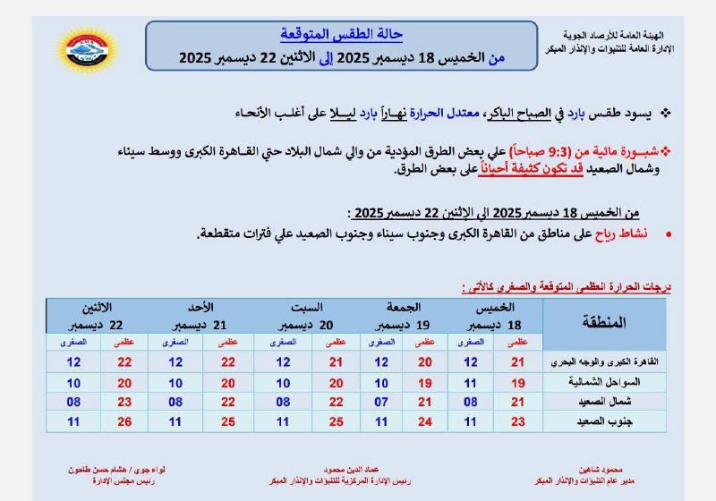 وفيما يلي بيان بدرجات الحرارة العظمى والصغرى المتوقعة خلال الفترة من الخميس 18 ديسمبر وحتى الاثنين 22 ديسمبر 2025: