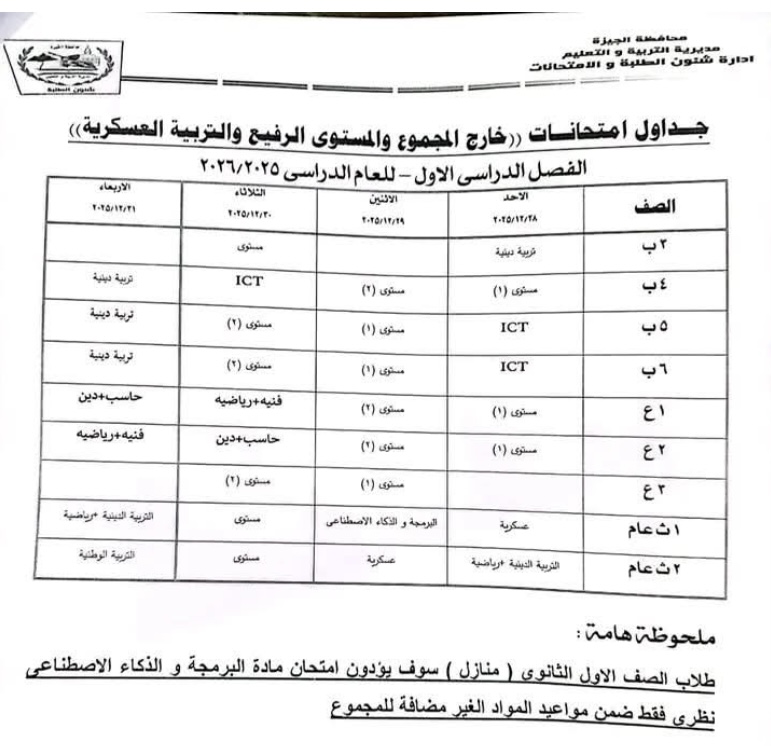 وفقًا لما أعلنته وزارة التربية والتعليم، يؤدي طلاب الصف الثالث الإعدادي امتحانات الفصل الدراسي الأول خلال الفترة من 17 إلى 22 يناير 2026، مع الالتزام الكامل بالتعليمات المنظمة لسير الامتحانات داخل اللجان.