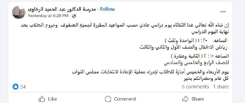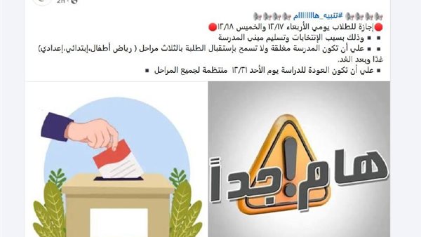 وفي الوقت نفسه أكدت وزارة التربية والتعليم أن باقي المدارس التي لا تستخدم كلجان انتخابية لن تتأثر بهذه الإجازة، وستستمر الدراسة فيها بشكل طبيعي دون أي تعطيل.