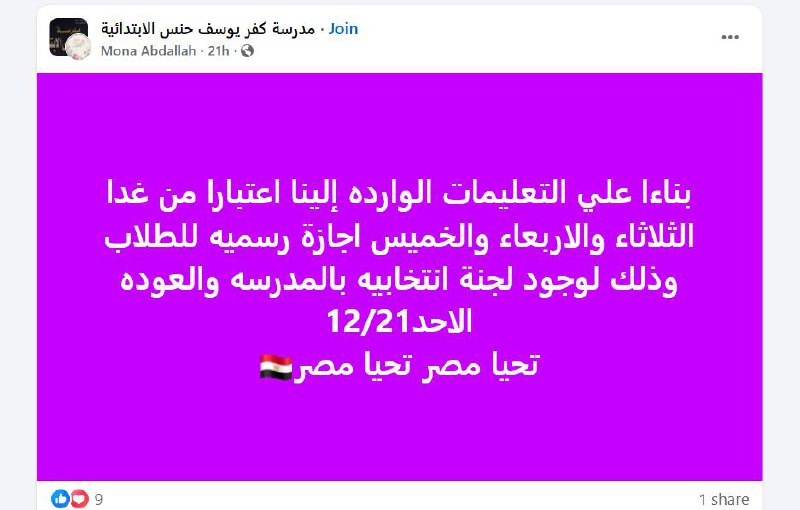 أوضحت إدارة المدارس أن الأربعاء 17 ديسمبر والخميس 18 ديسمبر 2025 سيكونان إجازة للطلاب في المدارس المخصصة كلجان انتخابية، مع التشديد على ضرورة العودة إلى الانتظام الكامل في الدراسة الأسبوع القادم لجميع المراحل التعليمية.