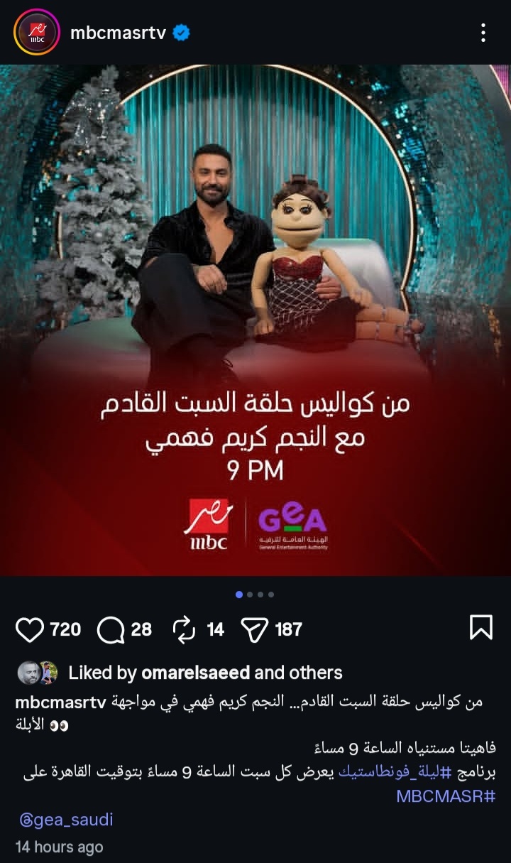وأعلنت الصفحة الرسمية لـ قناة mbc مصر عن استضافة أبلة فاهيتا للفنان كريم فهمي في برنامجها ليلة فونطاستيك في حلقة السبت المقبل، حيث نشرت بعض الصور من الكواليس عبر حسابها الرسمي على موقع " إنستجرام" وعلقت علي الصور" من كواليس حلقة السبت القادم.. النجم كريم فهمي في مواجهة الأبلة، فاهيتا مستنياة الساعة ٩".