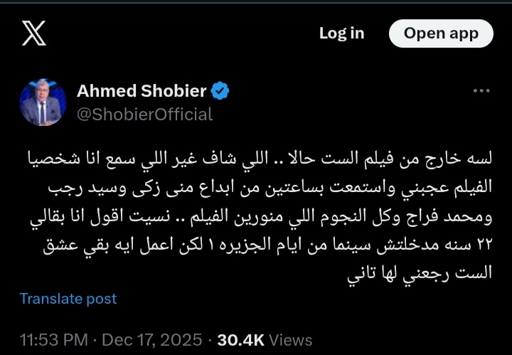 وقال شوبير في تغريدة له عبر حسابه على منصة إكس: لسه خارج من فيلم الست حالا، اللي شاف غير اللي سمع، أنا شخصيا الفيلم عجبني واستمعت بساعتين من ابداع منى زكى، وسيد رجب، ومحمد فراج، وكل النجوم اللي منورين الفيلم.
