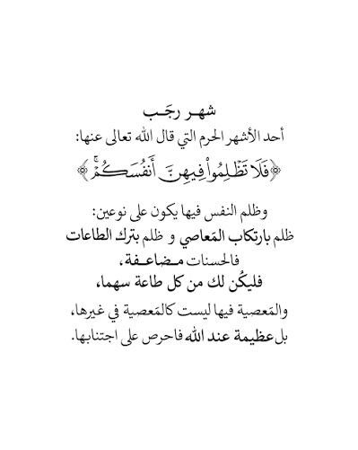 - كف الأذى: قال الله تعالى: (فلا تظلموا فيهن أنفسكم)، ورجب من الأشهر الحرم التي تتضاعف فيها الحسنات والسيئات. لذا، يُستحب الابتعاد عن الغيبة والنميمة وإيذاء النفس أو الغير.