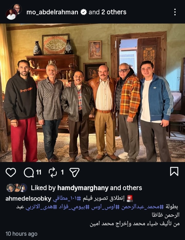 ونشر السبكي صورة تجمعه بأبطال العمل من خلال حسابه الرسمي على إنستجرام وعلق عليها “انطلاق تصوير فيلم 101 مطافي، بطولة محمد عبدالرحمن اوس اوس بيومي فؤاد هدى الاتربي عبد الرحمن ظاظا، من تأليف ضياء محمد وإخراج محمد امين”.