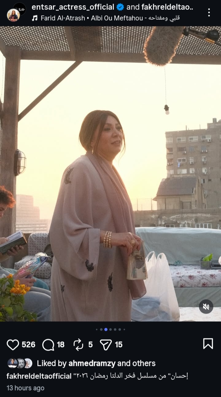 ونشرت إنتصار صورا من كواليس العمل من خلال حسابها الرسمي "إنستجرام" وعلقت عليها "إحسان من مسلسل فخر الدلتا رمضان ٢٠٢٦".