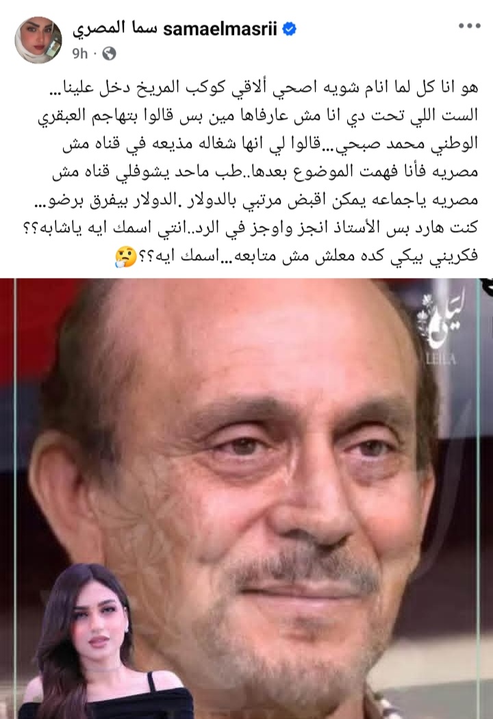 وكتبت سما من خلال حسابها الرسمي فيس بوك هو انا كل لما انام شويه اصحي ألاقي كوكب المريخ دخل علينا ، الست اللي تحت دي انا مش عارفاها مين بس قالوا بتهاجم العبقري الوطني محمد صبحي.