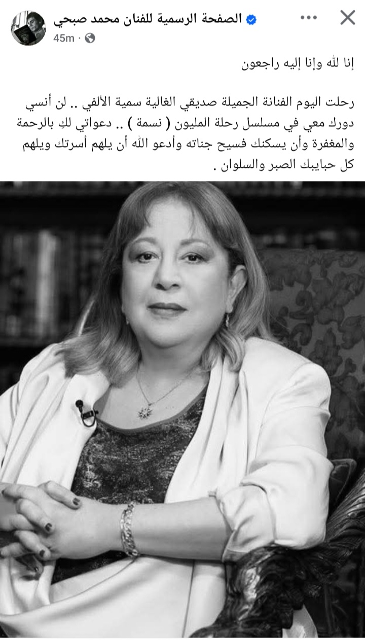 نعى الفنان محمد صبحي الفنانة الكبيرة سمية الألفي، والتي توفيت صباح اليوم السبت ٢٠ ديسمبر عن عمر ناهز 72 عامًا بعد صراع مع المرض .